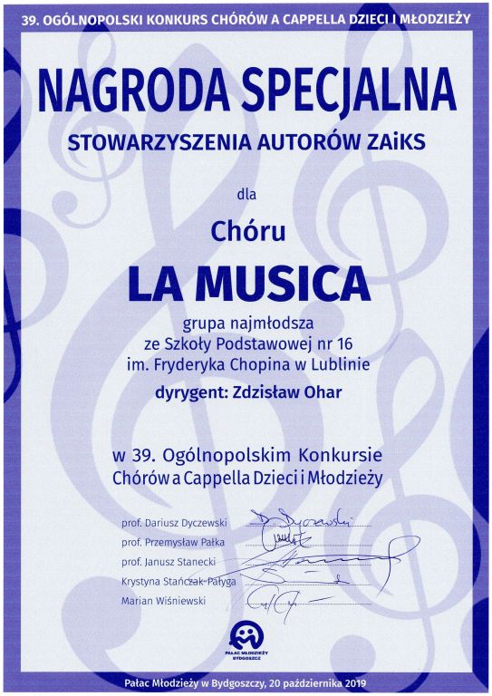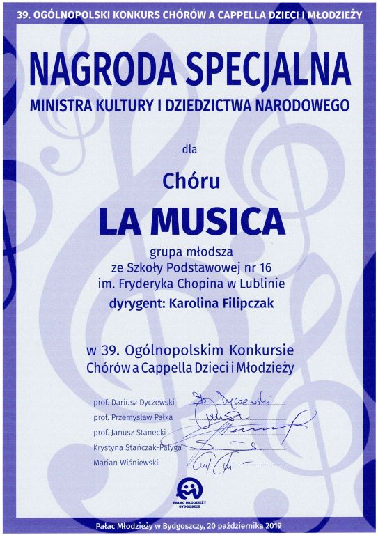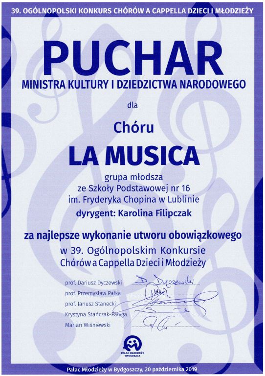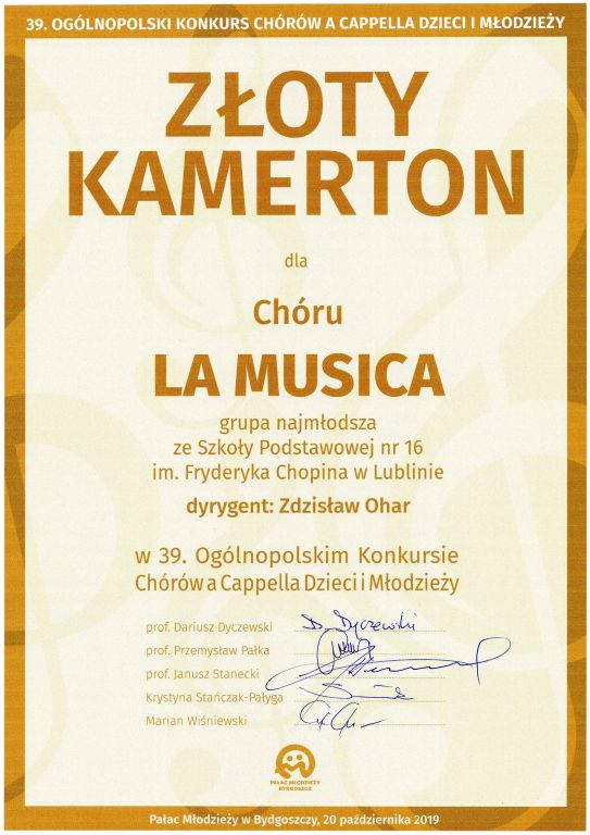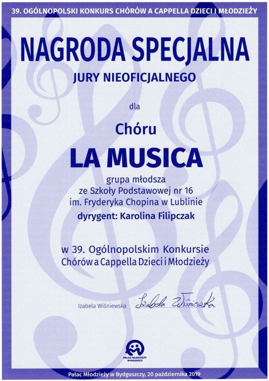 Październikowy wyjazd Chóru do Bydgoszczy na stałe wpisał się w grafik imprez chóralnych. Ogólnopolski Konkurs Chórów a’ Cappella Dzieci i Młodzieży w Bydgoszczy jest jedną z największych w Polsce imprez dla amatorskich chórów dziecięcych i młodzieżowych z atmosferą uzależniającą pozytywną energią miejsca i czasu, pokazującą, że warto być nie koniecznie mieć. Najprościej, kto choć raz był uczestnikiem tego święta muzyki najlepszych głosów chóralnych Polski, chce wracać… a to wcale nie jest łatwe.