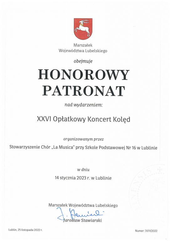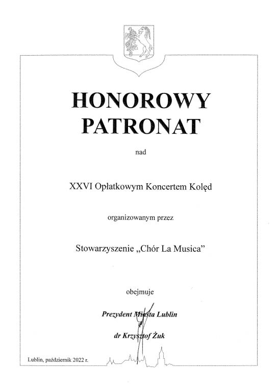 Patroni honorowi: Wojewoda Lubelski Lech Sprawka, Marszałek Województwa Lubelskiego Jarosław Stawiarski, Prezydent Miasta Lublin Krzysztof Żuk, Starosta Lubelski Zdzisław Antoń, Międzynarodowy Portal Chóralny Chórtownia.